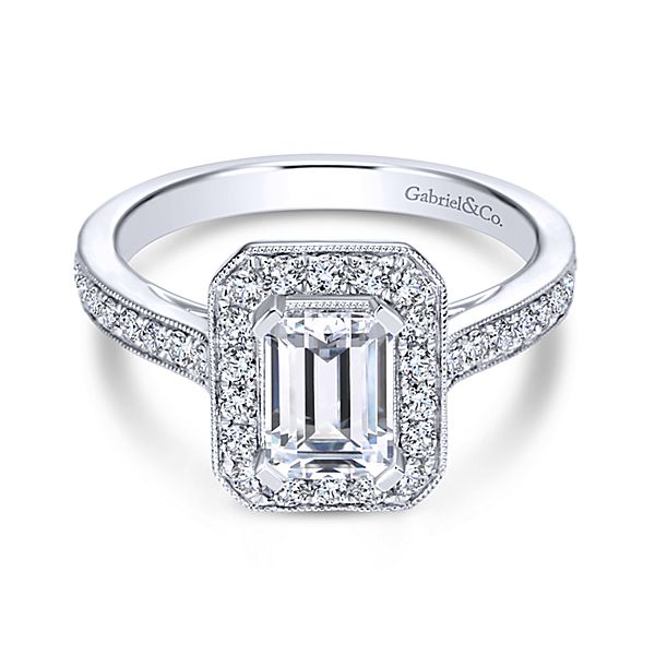 SAMPLE D=0.52cttw Vintage 14k White Gold Emerald Cut Halo Diamond