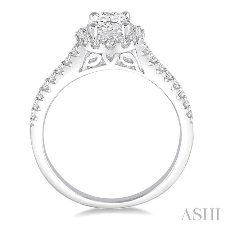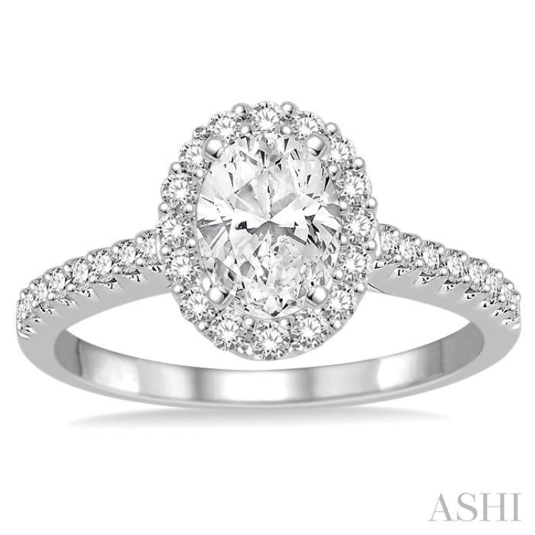 This exquisite Diamond Semi-Mount ring has a luminous charm that makes it even more attractive. 32 dazzling round cut diamonds are studded in a band and in a halo pattern around the core in prong setting. You can choose a center stone for the core ranging from 0.70 carat to 1.00 carat. This ring is made in 14 karat White Gold with normal finish. Total diamond weight is 1/3 Ctw.