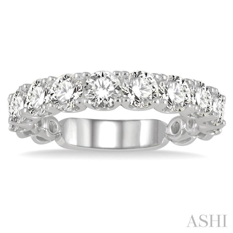 A gorgeous lattice diamond wedding band, this makes a great show of your love for her. So go for it, buy her this stunning wedding band! The gleaming round cut diamonds add glamor and beauty to the ring, which otherwise has no other decorations to divert attention from the precious stones. There are 10 bright prong set round cut diamonds embellishing the ring top, with the prong setting adding a charming lattice look from the sides. The grand wedding band is fashioned in 14 karat white gold. Total diamond weight is 2 ctw.