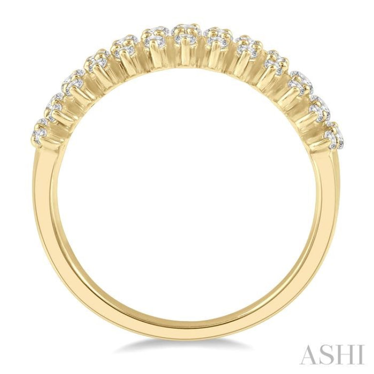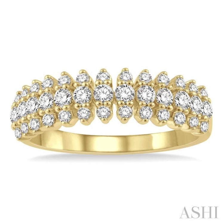 An attractive graduated diamond fashion band, this definitely makes a great addition to your jewelry box. It features a row of triple lined diamonds that make up the spectacular ring top. As this is a graduated ring, the side diamonds on the last two settings on either side, get slightly smaller than the previous rows. There is a total of 13 prong set round cut diamonds in the center row, with 13 each prong set round cut diamonds flanking the center diamond on either side, total 26. The graduated diamond fashion band is styled in 14 karat yellow gold. Total diamond weight is 3/4 ctw.