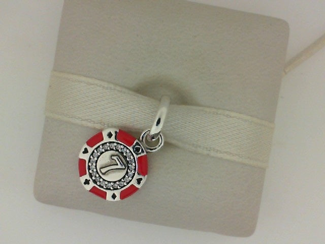 Casino token sterling silver dangle with clear cubic zirconia, red and black enamel